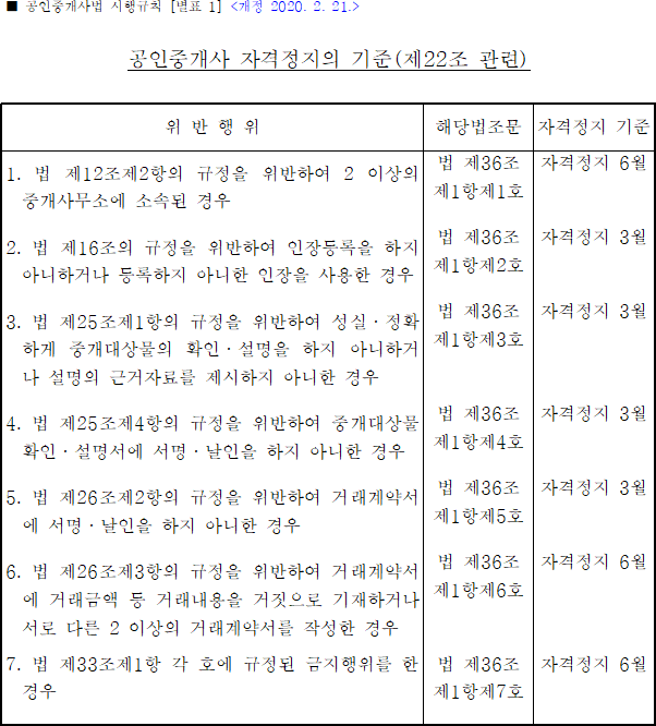 중개사법 공인중개사법 - 지도·감독 총회 학습(오답) Q. 공인중개사법령상 공인중개사의 위반행위에 대한 자격정지기준이 3월인 경우는? 11. 공인중개사법령상 공인중개사의 위반행위에 대한 자격정지기준이 3월인 경우는? ① 하나의 거래중개가 완성된 때 서로 다른 두개의 거래계약서를 작성한 경우 ② 중개대상물의 확인ㆍ설명의 근거자료를 제시하지 않은 경우 ③ 개업공인중개사가 동시에 다른 개업공인중개사의 소속공인중개사로 된 경우 ④ 거래계약서에 거래내용을 거짓으로 기재한 경우 ⑤ 당해 중개대상물의 거래상 중요사항에 관하여 거짓된 언행으로 중개의뢰인의 판단을 그르치게 한 경우 정답체크 1번 2번 3번 4번 5번 확인 해설보기 ② 중개대상물의 확인ㆍ설명의 근거자료를 제시하지 않은 경우 번호구분내용1조문 2서식3솔루션공인중개사법령상 중개대상물의 확인ㆍ설명의 근거자료를 제시하지 않은 경우는 기준이 3월이고 나머지는 모두 그 기준이 6월이다.(법개정됨) 스크랩 다음문제 이전문제